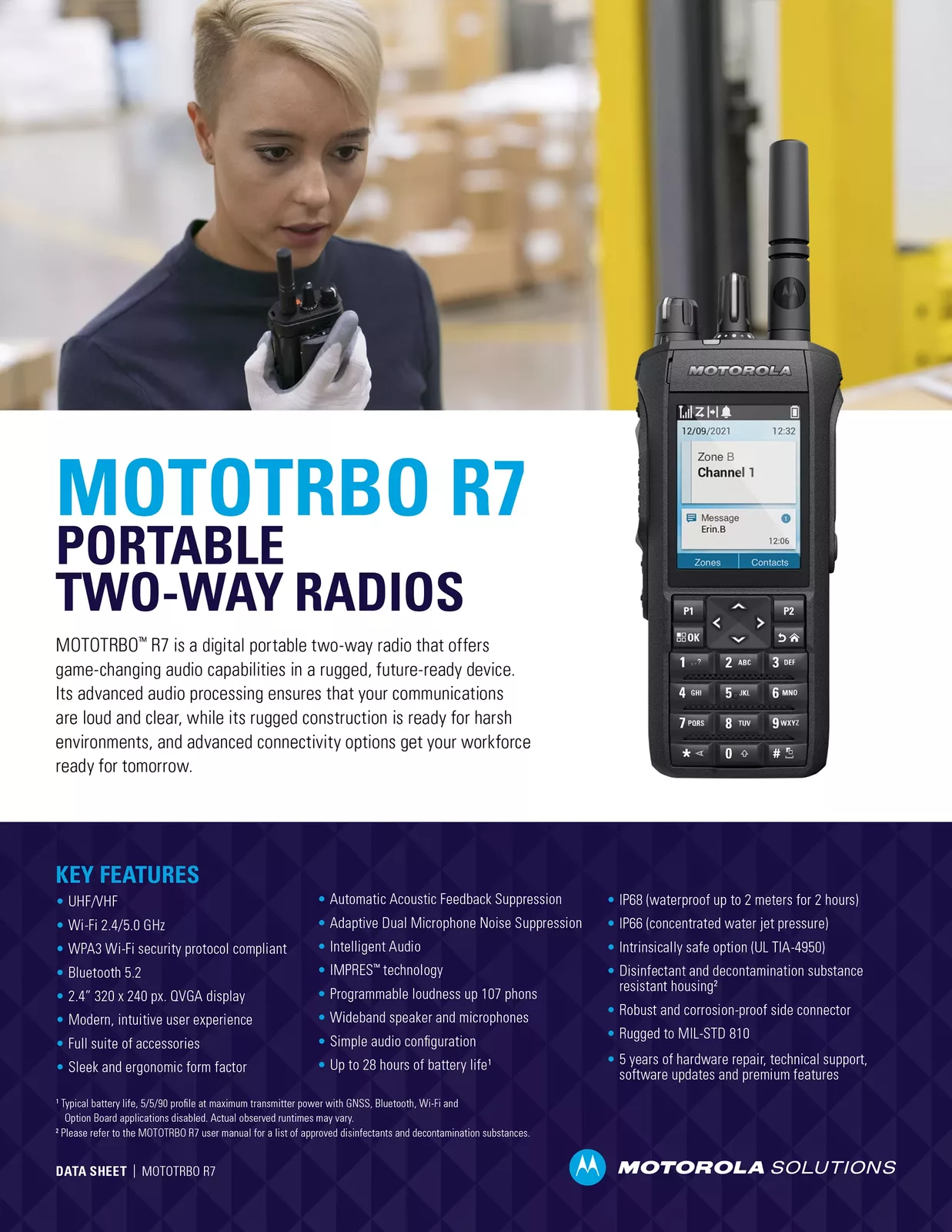 MOTOTRBO R7 具有颠覆性音频功能,不仅坚固耐用,而且能够适应未来发展需求。其高端的音频处理可确保您的通话响亮清晰,而其坚固的结构可适应恶劣的环境,先进的连接选项让您的员工从容应对未来的需求。